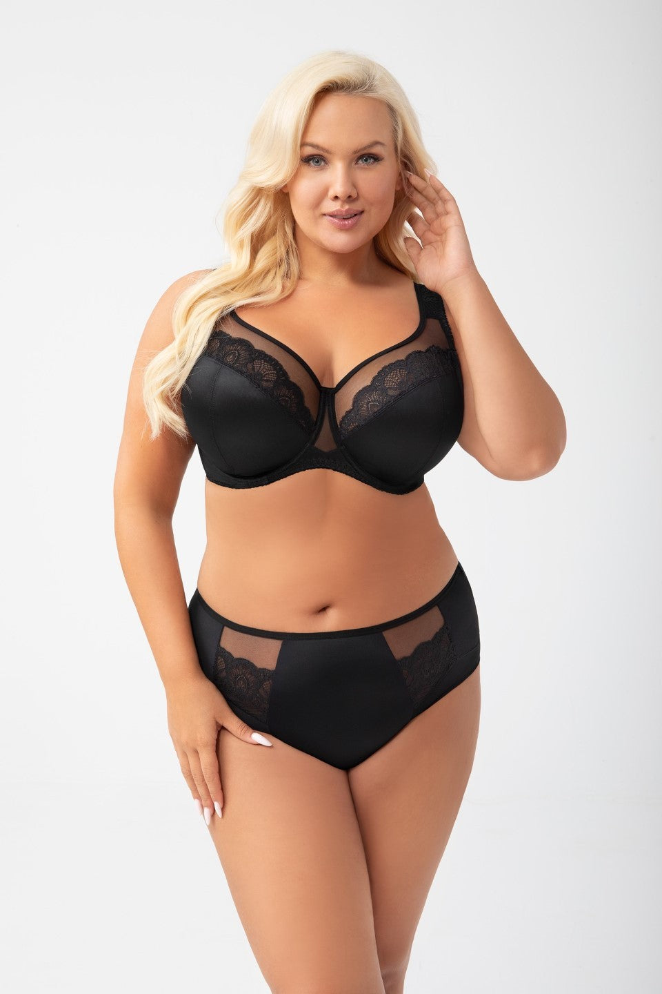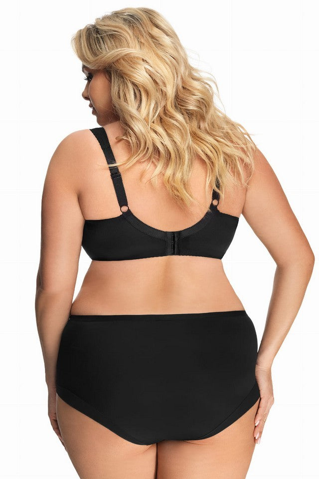 Miseczki wyprofilowane drutem okalającym piersi zapewniają naturalny, zaokrąglony kształt i lekkie uniesienie. Szerokie boczki z mocnej lycry, wzmocnione fiszbinami bocznymi, zapobiegają zwijaniu się materiału i zwiększają stabilność. Komfort noszenia podnoszą szerokie, miękko podszyte ramiączka z pianki i koronki, które odciążają ramiona i kręgosłup.