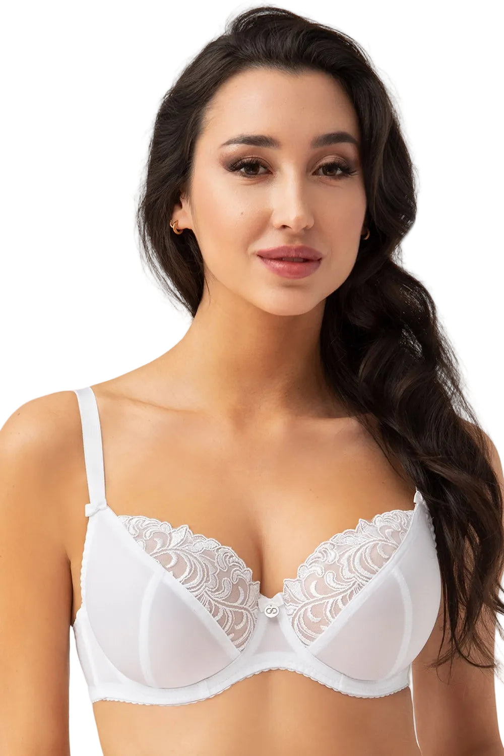 Dolna część miseczek została uszyta ze stabilnej dzianiny, natomiast górna z haftu podszytego delikatną siateczką, co zapewnia dobre wsparcie i estetyczne wykończenie. Wyprofilowane druty zbierają piersi do środka, unoszą je i nadają im naturalny, zaokrąglony kształt, jednocześnie pięknie eksponując dekolt.