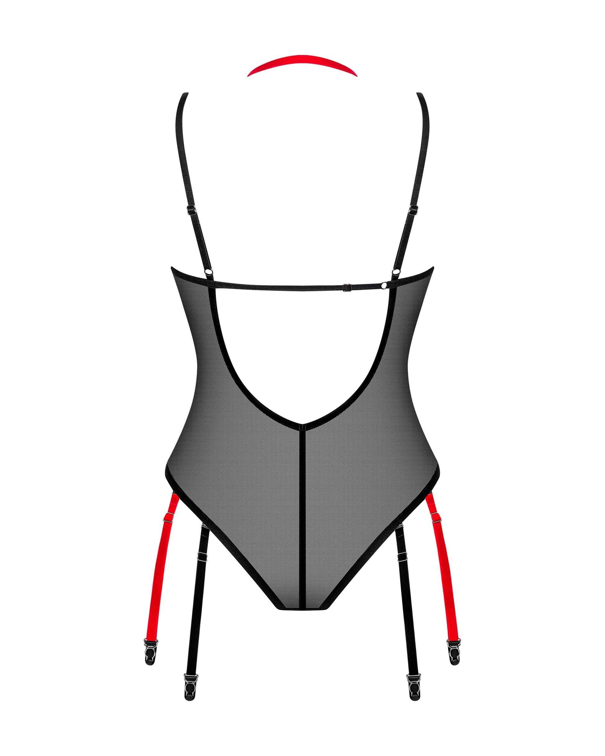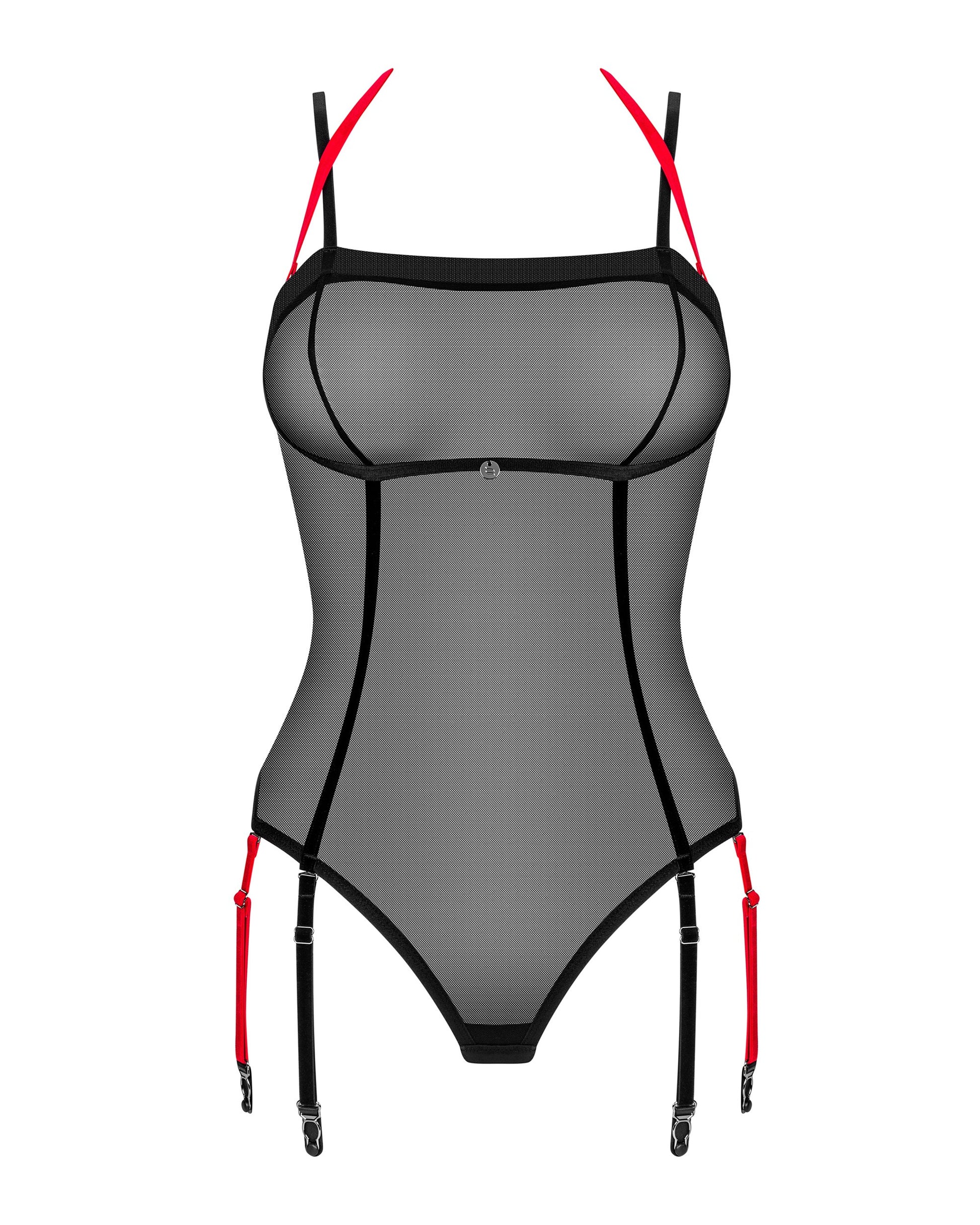 Transparentny materiał subtelnie eksponuje sylwetkę, a dopasowany krój pięknie podkreśla kobiece kształty. Zmysłowe paseczki dodają całości efektu drapieżnej elegancji, tworząc wyrafinowany, uwodzicielski look.