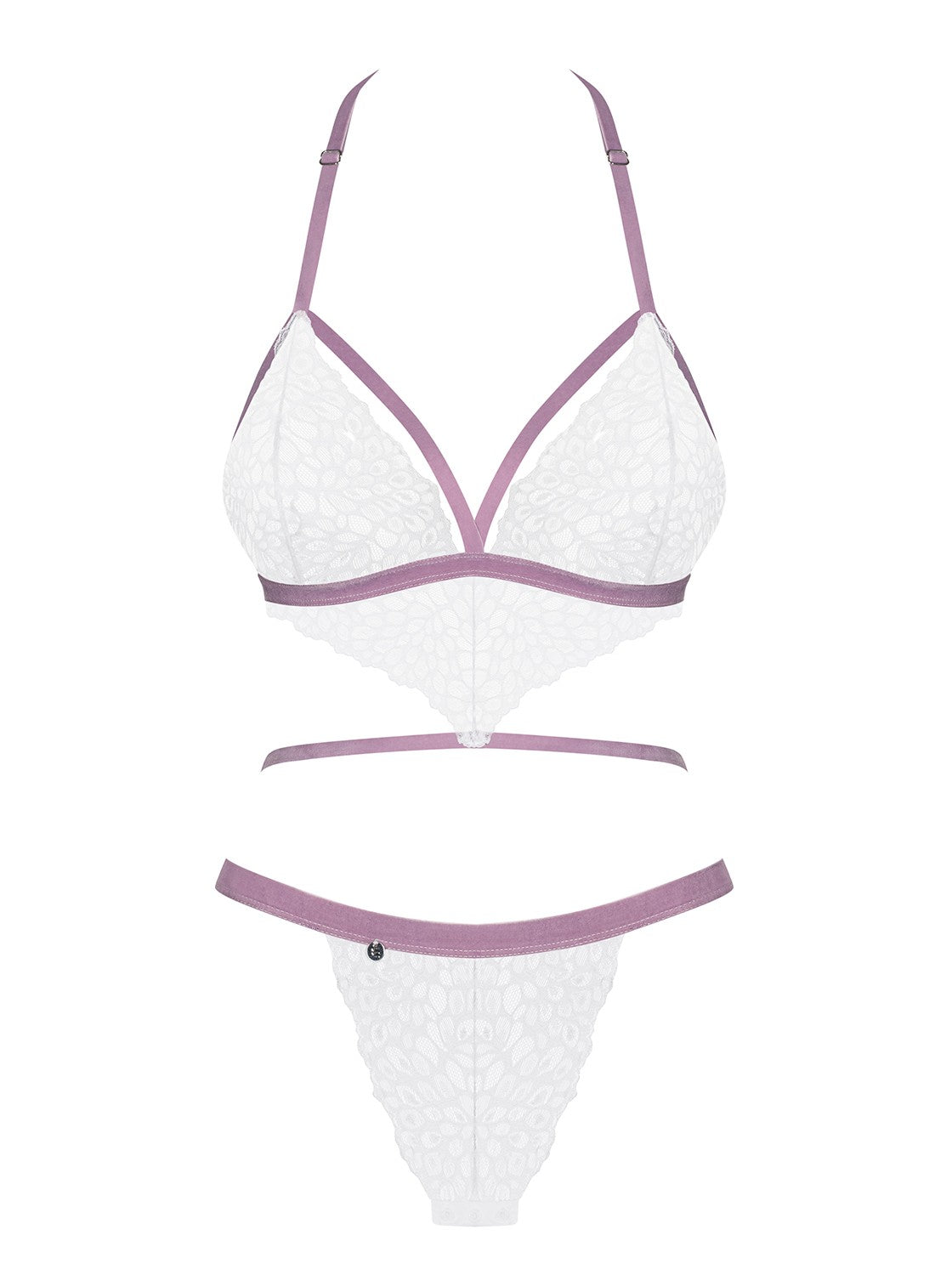 Połączenie białej koronki z liliowymi paseczkami tworzy wyjątkowo kobiecą i subtelną kompozycję. Delikatnie prześwitujący materiał pięknie eksponuje sylwetkę, nadając całości lekkości i zmysłowego charakteru.