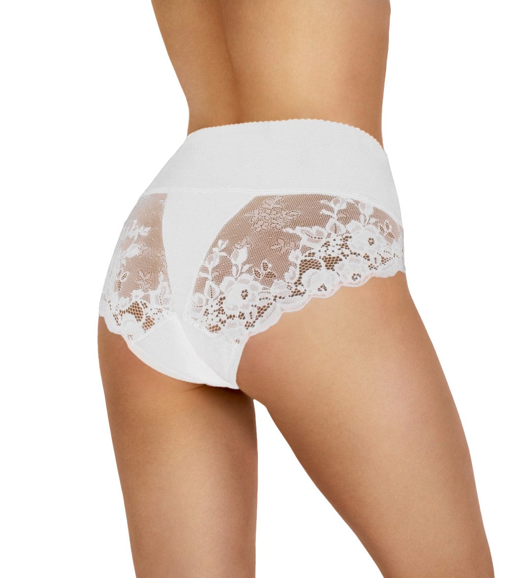 Figi Damskie 113 to model o zabudowanym, komfortowym kroju, który zapewnia wygodę i dobre dopasowanie do sylwetki. Pas ozdobiony jest uroczymi satynowymi kokardkami, dodającymi całości kobiecego uroku. Tył wykonany z efektownej koronki o kwiatowym motywie podkreśla elegancki i zmysłowy charakter bielizny.