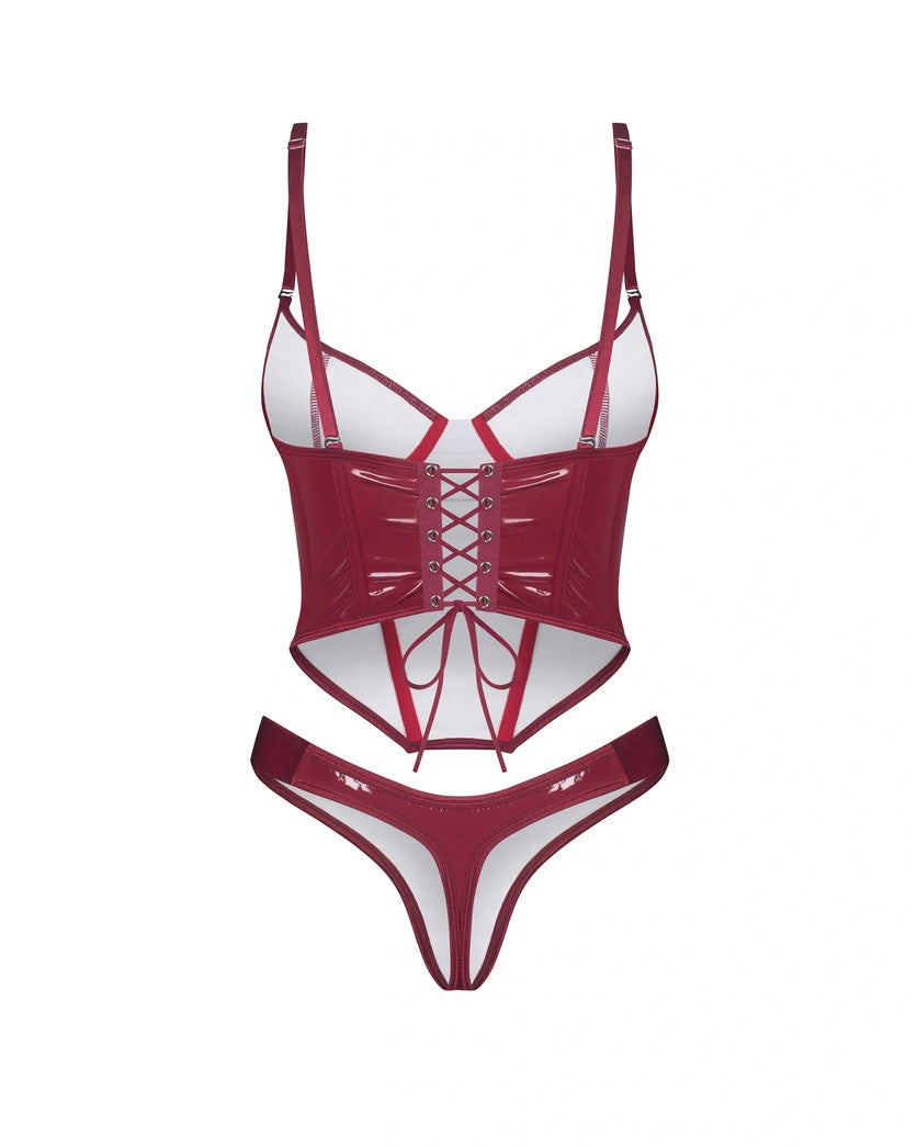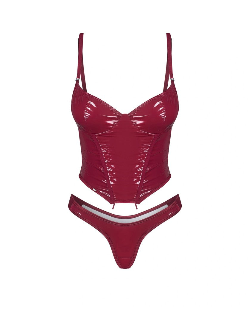 Gorset i stringi Redya to odważny, niezwykle zmysłowy komplet stworzony z myślą o kobietach, które chcą podkreślić swoją pewność siebie. Gładka, lakierowana powierzchnia z efektem lustrzanego połysku przyciąga spojrzenia i nadaje całości luksusowego charakteru. Modelujące przeszycia pięknie dopasowują się do sylwetki, akcentując talię i kobiece kształty, a regulowane sznurowanie na plecach pozwala idealnie dopasować obwód. Miękkie miseczki oraz regulowane ramiączka zapewniają komfort noszenia, a dopasowane stringi doskonale dopełniają zestaw, tworząc spójną i wyjątkowo elegancką całość.