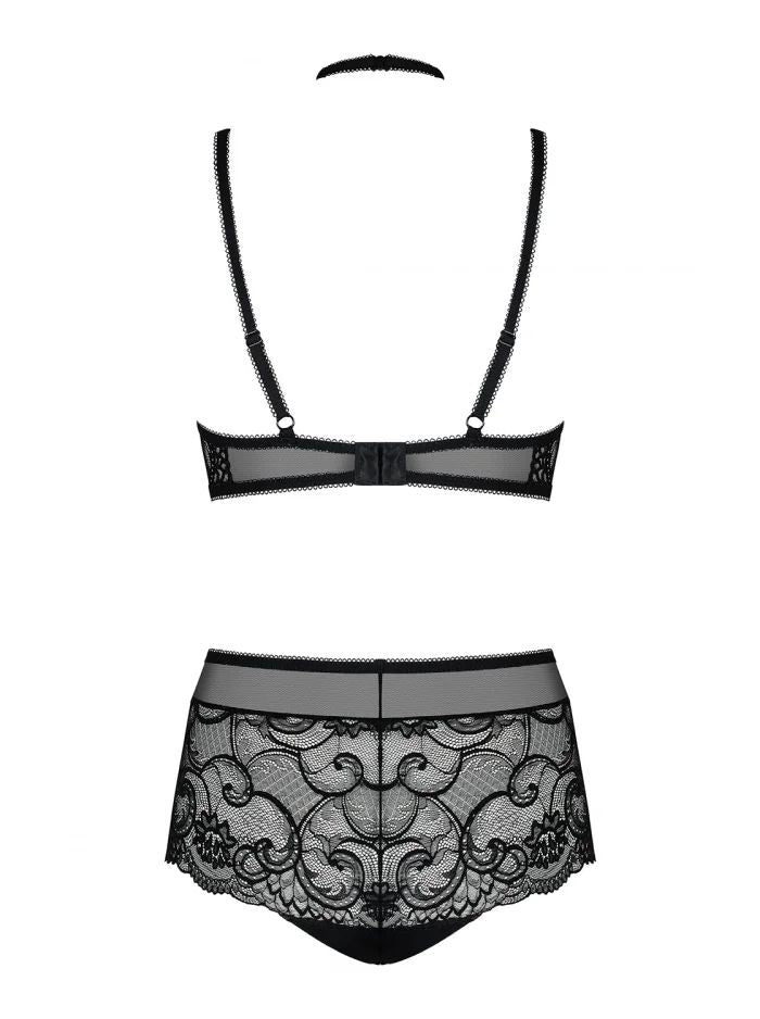 Czarny biustonosz i szorty wykonane z miękkiego materiału. Koronkowy choker ze srebrną zawieszką – stworzony by przyciągać wzrok. Regulowane ramiączka i kilkustopniowe zapięcie – idealne dopasowanie. Prześwitujące miseczki z fiszbinami – zjawiskowo podkreślony biust. Mini gorsetowe wiązanie między piersiami – super kobiecy akcent. Szorty z koronki o rozkosznym wzorze. Niezwykle przyjemny i perfekcyjnie elastyczny materiał.