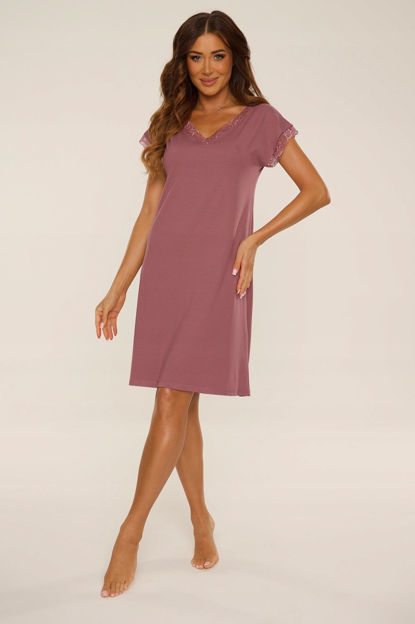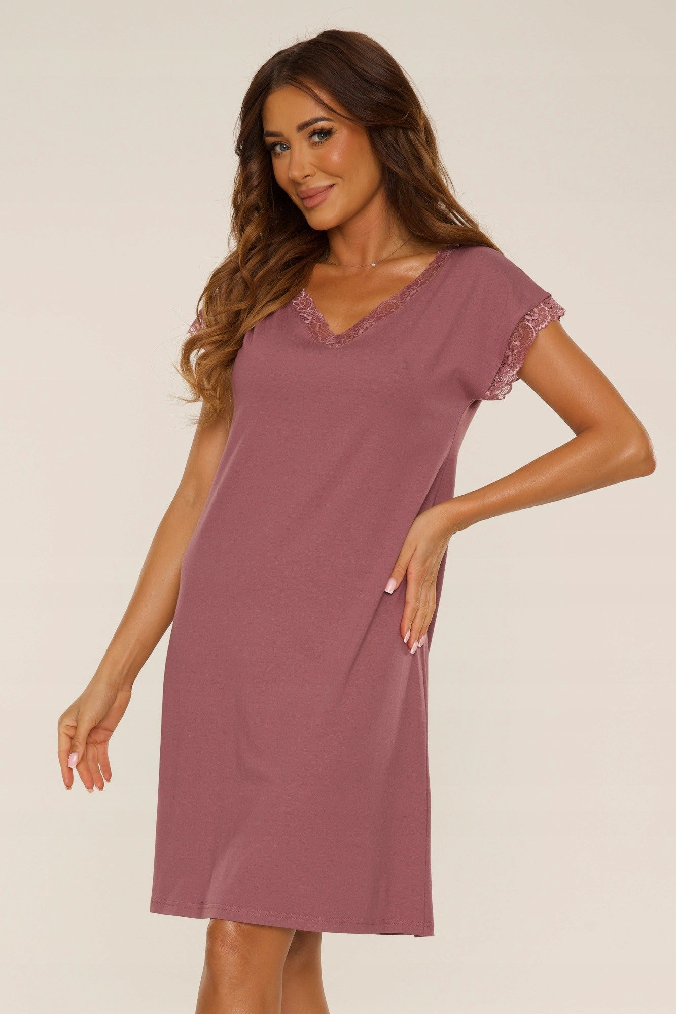 Model posiada krótki rękaw wykończony subtelna koronką, która dodaje całości romantycznego charakteru. Dekolt w kształcie litery „V” został ozdobiony koronką zarówno z przodu, jak i z tyłu, co nadaje koszuli wyjątkowej lekkości i zmysłowego wyrazu. Dół puszczony swobodnie zapewnia wygodę noszenia oraz naturalny, delikatnie opływający fason. Długość do kolana sprawia, że model jest praktyczny i uniwersalny.