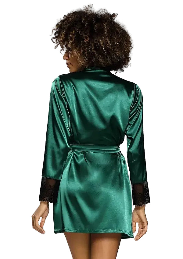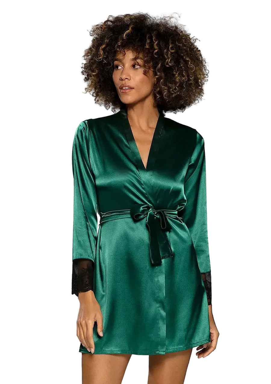 Sięga przed kolana, a długie, luźne rękawki wykończono czarną koronką, która dodaje całości kobiecego uroku. Podomka przewiązywana jest cienkim paskiem, który podkreśla talię i pozwala na indywidualne dopasowanie do sylwetki.