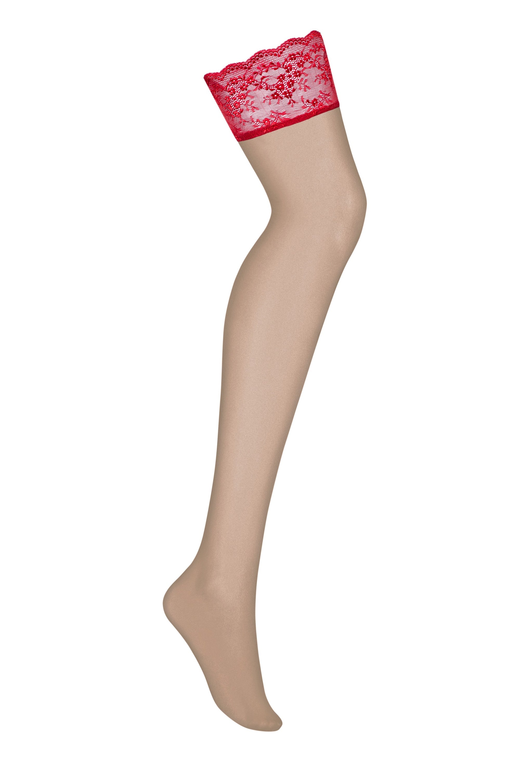 Pończochy Lovica to idealne dopełnienie całej kolekcji, stworzone z myślą o kobietach ceniących zmysłową elegancję. Zdobione czerwoną koronką z połyskującym, kwiatowym wzorem, pięknie podkreślają uda i przyciągają spojrzenia. Delikatna siateczka w cielistym odcieniu subtelnie odsłania nogi, dodając całości lekkości i uwodzicielskiego charakteru.